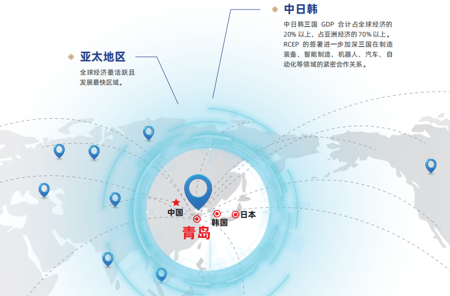 同时,山东与日韩经济关系密切,在世界经济版图和国际经贸合作中占据重要位置。从国内国际双循环看,青岛是东向日韩、西向“一带一路”沿线国家的新亚欧大陆桥的重要节点。